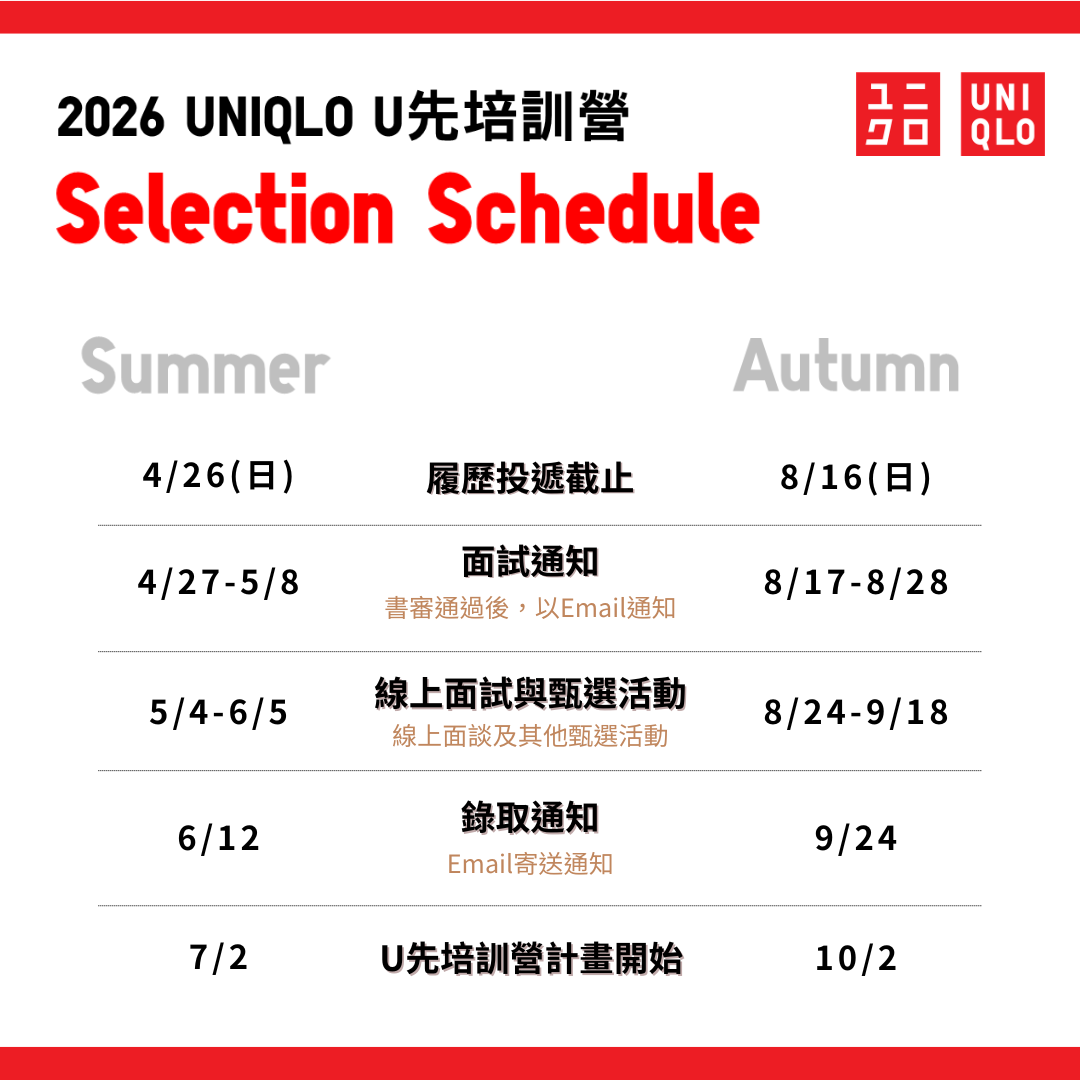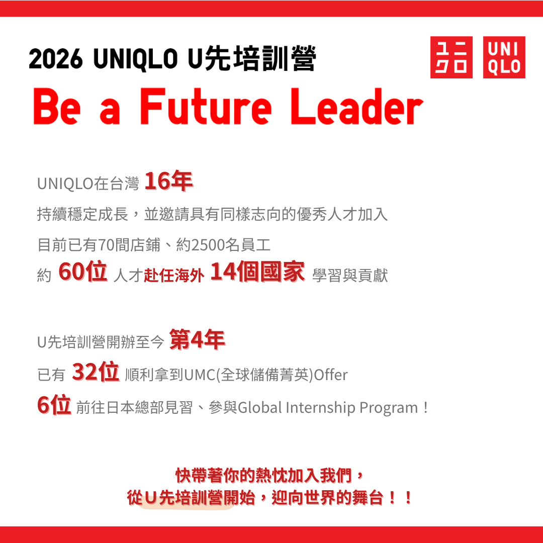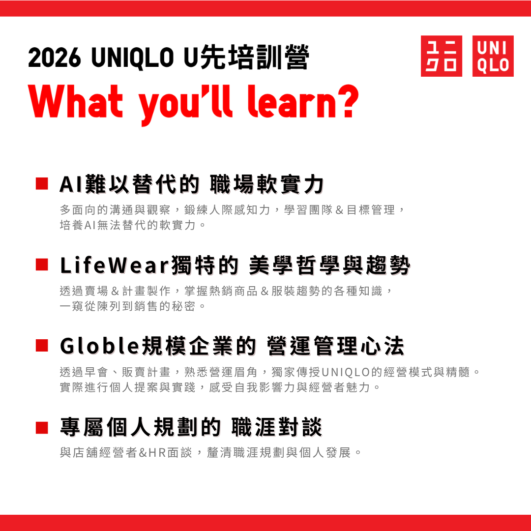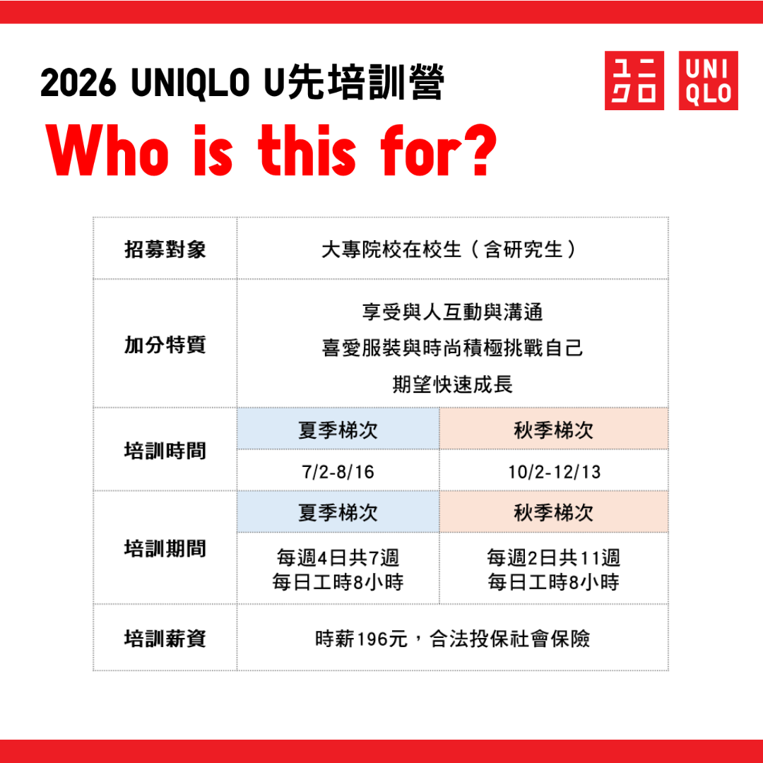 🔥 夏季投遞只到4/26🔥2026 UNIQLO U先培訓營 兩梯次熱烈招募中!